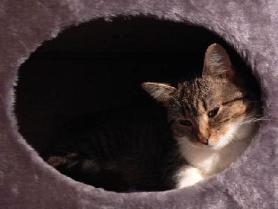 Kocouři a kocouřky, musím se vám svěřit se svýma obavama. Doma se nám dějí dost divné věci. Slečna s páníkem koukají na obrázky cizích!!! koček a povídají, jak která je pěkná, jako bych já nebyla ta nejhezčí. Taky jsem zaslechla něco o umisťovací výstavě, snad mě nechtějí někam umístit a vyměnit za jinou kočku? Slečna koupila druhou budku na šplhadlo (na co, proboha? Mně jedna stačí, podívejte se na obrázek, že mi ven nevisí ani ocásek!) a povídala, že se to bude muset lépe přidělat ke zdi, aby to tu váhu vydrželo (tak jako bacha, to mě dost urazilo, já si myslím, že jsem celkem štíhlá a čupr kost!).