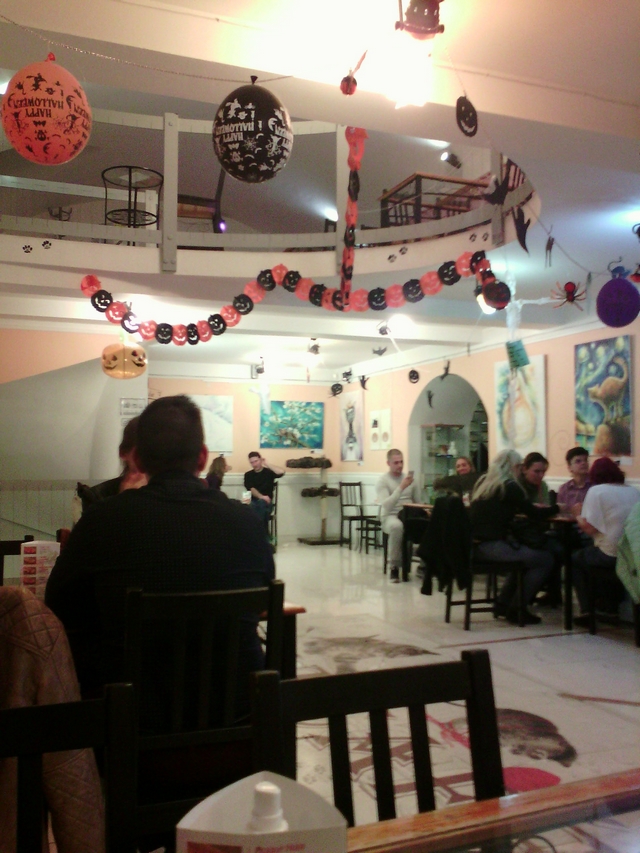 Možná i pro tuto pozornost byly kočky všude. Je jich tam všehovšudy dvanáct a nebylo třeba je hledat – hned vedle vstupních dveří jedna spala na topení, další 3 byly na škrabadle, jedna paní měla kočku přímo před sebou na stole, jen tak tam ležela a koukala kolem – a paní se ani nehýbala. Další kočka spala v rohu na sedačce z palet, místností občas prošel obrovský maiňák – skočil na jednom konci na stůl a koukal po kavárně, pak se šel na druhý konec kavárny napít do mističky u schodů, a pak zase jinam. Byl fakt obří, vyniklo to hlavně když míjel ostatní kočky. To bylo v první místnosti.