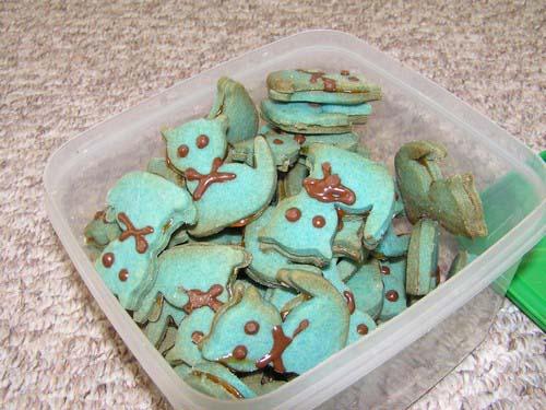 Popis: Modří kocouři připraveni u příležitosti velkého setkání dnes 8.4.2006. Modří kocouři se znaky kočky siamské. Těsto dobarveno modrým práškem z lékárny. Nebyli zachováni pro další pokolení, nikoli díky své svérázné chuti, ale proto, že patrně skončili v kontejnéru. Maxíkovo díklo tak zůstalo nedoceněno. Naštěstí se zachovala fotografie pro další pokolení.