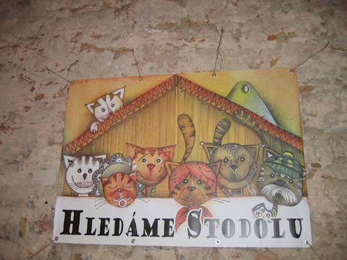 Tvrz nebylo složité najít. Už od hlavní silnice u nákupního centra jsem si všimla směrovek. Blížila se jedenáctá hodina a parkoviště u tvrze bylo skoro plné. Cestou jsme míjeli asi 5 šťastných lidí s kočkopytlíky skrývajícími vyjukané kočičáky. První pohled byl parádní, "fronta na kočky" se táhla od vchodu podél celé stodoly a lidí stále přibývalo. Ale co, bylo krásně a my jsme přece přijeli potěšit kočičky. Ve frontě jsme se střídali. Já šla omrknout, co nabízeli ve stodole. Pohladila jsem si fretku, prohlédla obrázky od dětí a očíhla dobročinný obchůdek. Ve stanu před vchodem čekali na nové páníčky také tři pejsci. Po půl hodině jsme se dostali k mladíkovi, co dával vstupenky. A mladík se zarazil a říká: vždyť vy jste jen tři a přinesli jste tolik konzerv?! Tak to mockrát děkujeme. Na schodech nás míjela Pavlínka od Agátky. A bez drobečka. Prý tam nebyla žádná koťátka.