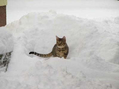 Moji milí kočičáři, jistě jste to taky zaznamenali, z nebe padalo něco bílého. Padalo to několik dní, pořád a pořád. Měli jsme toho plnou zahradu. Co to je? To jsem ještě neviděla. Velké holky mi řekly, že je to sníh. Hmm a k čemu je takový sníh dobrý? To jsem teda nevěděla. Až jednou, řádili jsme v předsíni jako obvykle, když panička nestihne zavřít dveře a my jí tam proklouzneme. Panička tam ale tentokrát zůstala s náma, oblékla se a otevřela dveře ven. Júú. Teda, já už venku byla, to jsem byla úplně malý prcek, ale jenom na chviličku. Tohle bylo něco jiného. Koukali jsme ze dveří a já se rozhodla jako první a skočila do toho bílého. Jé, to studí a je to měkké a boří se mi do toho tlapky. Ale úžasně se v tom skáče a dovádí. Wyuško, pojď se honit. Lítali jsme s Wyuškou v hlubokém sněhu a moc se mi to líbilo. Bettynka chodila způsobně po prohrabaných cestičkách, je z nás přece jenom nejstarší, tak se chová jako pravá distinguovaná dáma. Ale my na ní s Wyušou pořádaly výpady ze zálohy a házely sníh. V tom sněhu se taky úžasně hrabe. Už jste to někdy zkoušeli? Tak to vám teda doporučuju. A jak se do té vyhrabané díry příjemně čůrá. To taky zkuste. Holky to teda nezkusily. Prý to venku neumí, jenom doma. No to o hodně přicházejí, teda. Super zábava je taky sledování ptáčků na krmítku. Znám to z domova, sleduju je přes okno, ale venku, na živo, je to úplně něco jiného. Vidím kořist, přikrčím se, pomalu se plížím blíž a blíž, už jsem blízko, přikrčím se ještě víc. Zadní hrabáky mi začnou neposedně poskakovat. Zaútočím, odraz, skok, dopad a ... Kořist je fuč! Teda, ti ptáci jsou nebezpečně rychlý. Ale vydrželi jsme je s Wyušou sledovat velmi dlouho. Tak jsme si hráli a lítali ve sněhu, ale pak nás panička zahnala domů. Ale hned další den nás ven pustila zase. Chodili jsme na sníh každý den a bylo to žúžo, moc jsme si to užívali. Ani zima na kožíšek nám nebyla. Teda mně byla, mám mnohem menší kožich než velké holky, a kam se obě s Betty hrabeme na Wyušku. Ta má letos kožich jako medvěd. Ale já ho nemám, tak jsem se každou chvíli děsně klepala, ale domů jsem v žádném případě nechtěla. Tss, to není nic strašného, správná šelma vydrží všechno. No prostě se mi to venku moc líbilo. A běda, když jsme náhodou ven nešli. Seděli jsme s Wyuškou za dveřmi a dvojhlasně jsme zpívaly, že nutně potřebujeme jít ven. Někdy to zabralo, někdy ne. Někdy nás panička pustila třeba jenom na balkon, ale to není vůbec ono. Nejlepší je to na zahradě. Určitě to zkuste.