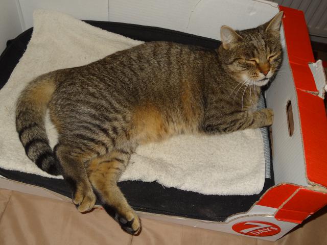 Tak jsem ho ještě odfotil v mé posteli a v oblíbené krabici z LIDL-a, kterou okusuje