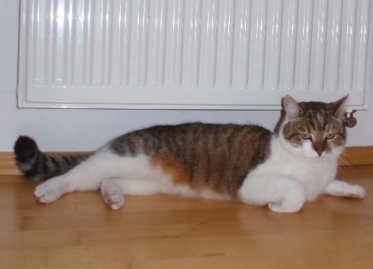 | Barva: | bílo-mourovaná s rezavými znaky na lemu bříška, hustý pruhovaný ocásek |