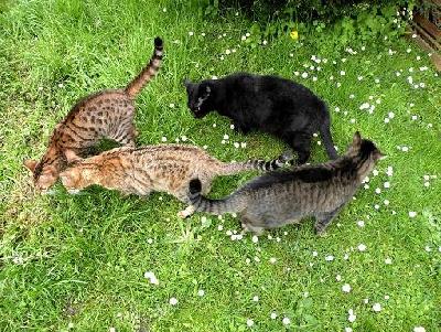 Jsem šťastnej kocour!! Konečně nás vzala na zahradu. Holka. Před přesunem nám uspořádala přednášku na téma Jdeme jen na chvíli a ať vás ani nenapadne chtít utéct! Svorně jsme oznámili, že nás to opravdu ani nenapadne, protože nás to napadlo už dávno a jenom holky nesnesitelný zvyk být nám neustále za... no... prostě, být nám v patách nám zabránil to zrealizovat. Když holka usoudila, že přednáška byla pochopena, otevřela nám dveře na chodbu. Při hromadném davovém přesunu došlo k drobné kolizi. Hroch zapomněl shromáždit své všechny dvě mozkové buňky a při zdolávání schodů buňky nevyslaly dostatečný signál k hroším dusadlům. Díky tomu část schodů Bubu neseběhl, ale skutálel. Holka konstatovala, že kdyby Mikeš pana Lady byl jako Bubu, nenapsal by pan Lada o mluvicím kocourkovi, ale o kutálejícím se. Naštěstí je Bubu na kutálení dobře vybaven a nedošel úhony, bystří pozorovatelé došli k závěru, že kutálení bylo tak rychlé, že ho hroší dvě buňky ani nezaznamenaly.