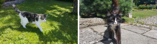 Dopoledne uteklo jako voda, obsluha na nás neměla čas, protože měla plné ruce práce s přípravou oběda, tak jsme si hodili malou chrupku a ani jsme nepostřehli, že přijela první tetička, a to teta Mirka od Gafíčka. Po přivítání s obsluhou se šla podívat po zahradě a my jako vzorní kocourci jsme ji šli pěkně přivítat, jak se sluší a patří. Aby bylo jasno, já tedy hned tak někoho nevítám, ale teta Mirka se mi mooooc líbila, takže jsem se od ní nechal nejen pohladit, ale i pochovat v náručí. Čertík, to je kapitola sama pro sebe, to je vítací typ. Ten se válí před každým, takže předváděl ty své žížalí sestavy a nechal se od ní drbat na bříšku. Společně jsme potom tetu hezky provedli po celé zahradě a dávali jsme bedlivý pozor, jestli jde za námi. Co kdyby se nám někde na naší veliké zahradě ztratila? Pak jsem ji musel propustit, protože obsluha volala tetu Mirku k obědu a my jsme se šli nabaštit s Čertíkem také.